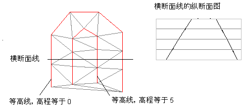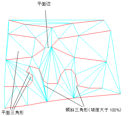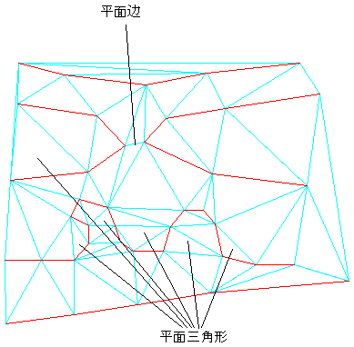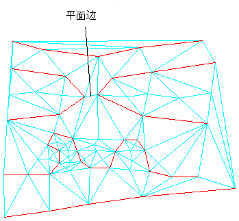 将等高线数据添加到三角网曲面后,获得的曲面可以包含平面点位(其点均来自于同一等高线的三角形)和平面边(在相同高程处同一等高线或不同等高线连接点的三角形边)。