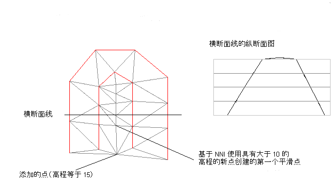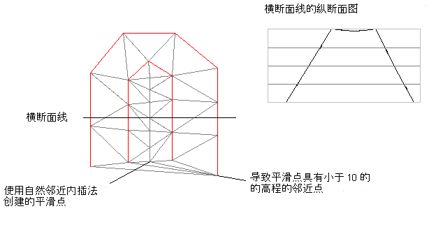 会出现这些结果是由于自然临近内插法使用了周围的点来确定适合的新点高程。由于所有临近的高程都低于平面三角形,因此为要添加的点选择了低于平面三角形的高程,从而导致了山脊中的下陷。