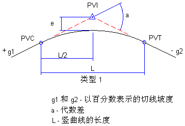 布局纵断面使用两类曲线:凸曲线和凹曲线。凸曲线放置在小山顶上,或任何坡率变小处。凸曲线有三类:从正坡率向负坡率过渡、从正坡率向正坡率过渡以及从负坡率向负坡率过渡: