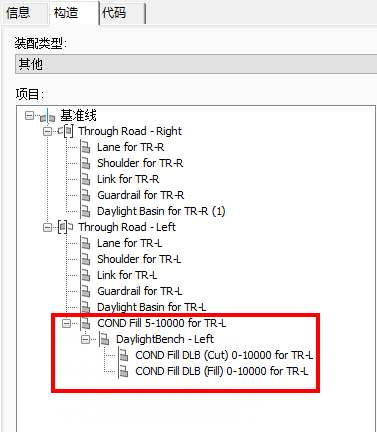 - 在“项目”列表中,选择位于装配左侧的条件部件。再次单击以亮显文字。更改名称,以使其指示根据设置要检测的条件类型。在以下示例中,第一个条件部件的名称已更改为 COND Fill 0-5 for TR-L。在此示例中,COND 指示了部件为条件部件。Fill 指示了激活部件的条件类型。0-5 指示了部件期望的填方条件的最小距离值和最大距离值。在此示例中,TR-L 是对与此特定部件相关联的上级装配的名称的引用(在此例中为“Through Road”或“TR”和“Left side”或“L”)。