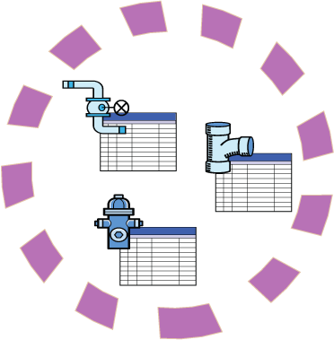 这个圆表示一个 SDF 文件,它具有单一模式,定义三个要素类:阀、管和消防栓。