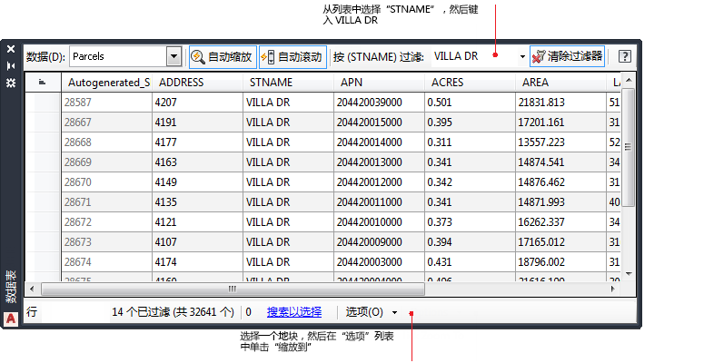 显示任何图层的数据表。 过滤数据表以显示地块子集 - 在本例中,仅为 Villa Drive 上的地块。