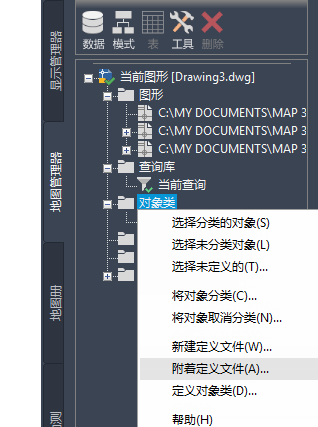 2. 通过在“任务”窗格的“地图管理器”选项卡上的“对象类”上单击鼠标右键,然后单击“附着定义文件”,可以附着对象定义文件。