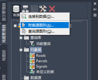 4. 在“任务”窗格中的“地图管理器”选项卡上,依次单击“数据”“附着源图形”。