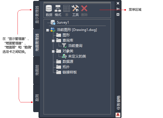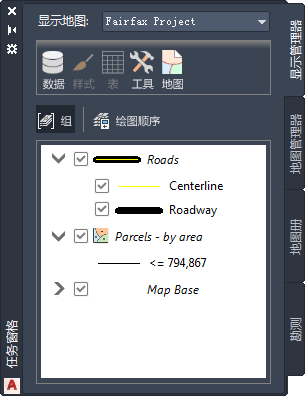 使用“任务窗格”,您可以快速访问常用的要素,并将这些要素编组到与任务相关的视图中。使用“任务窗格”可以创建、管理、显示和发布地图。
