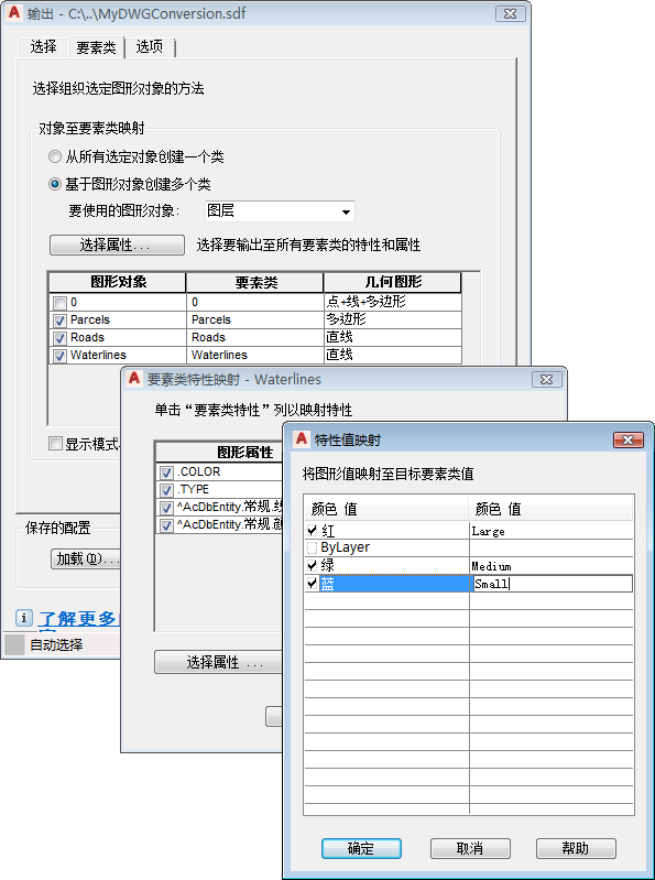 通过“要素类”选项卡,也可以将 AutoCAD 图形特性映射为 SDF 要素类中的特性。如果已在图层内使用颜色、线宽或线型表示对象特性,则可以将这些特性映射到其所表示的特性。在该图形中,将颜色映射到水线大小。可以将每种水线颜色映射到单独的要素特性。