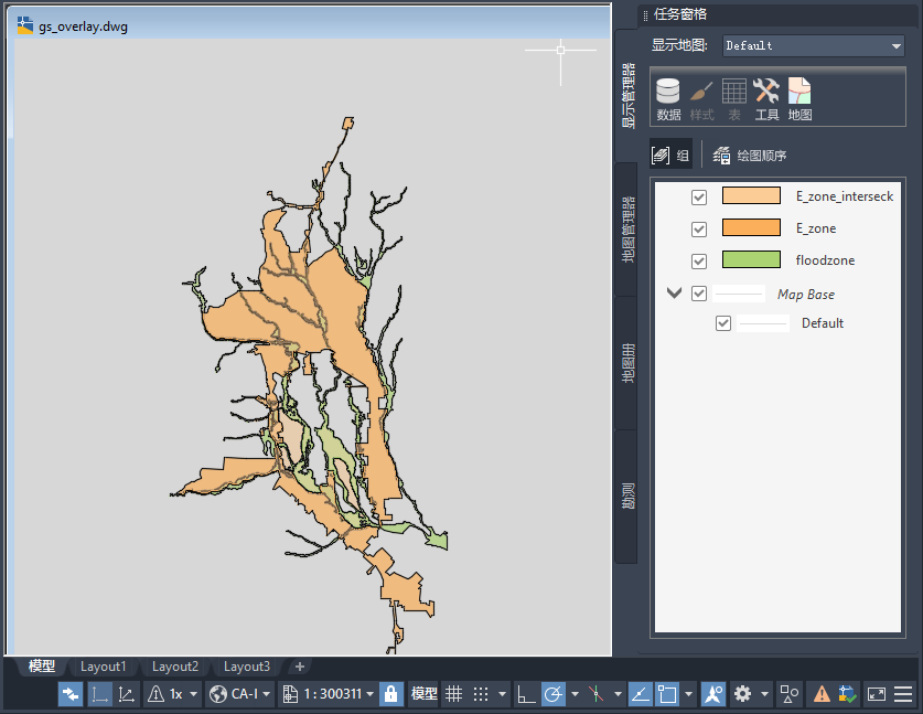 此地图覆盖两个图层(洪水淹没区和企业区)。可以使用覆盖查看两个图层的交集。交集区域成为新图层,可为其设置样式并保存至文件,还可以将其用作单独的数据存储。