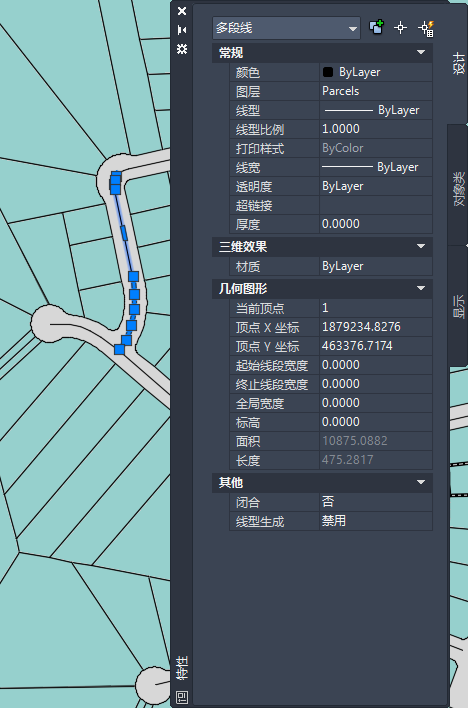 “特性”。 粉色多段线表示地块并具有与地址、面积、值等有关的对象数据。