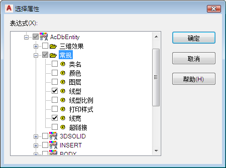 5. 在“选择属性”对话框中,展开“对象特性”项、“AcDbEntity”和“常规”项。