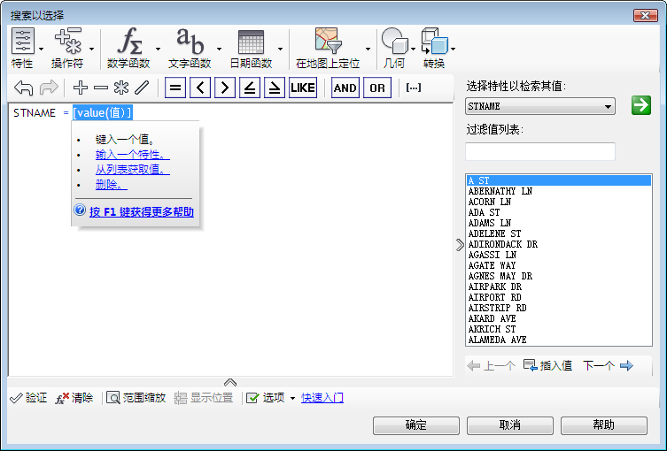 4. “搜索以选择”窗口中,单击“特性”,然后选择“STNAME”。