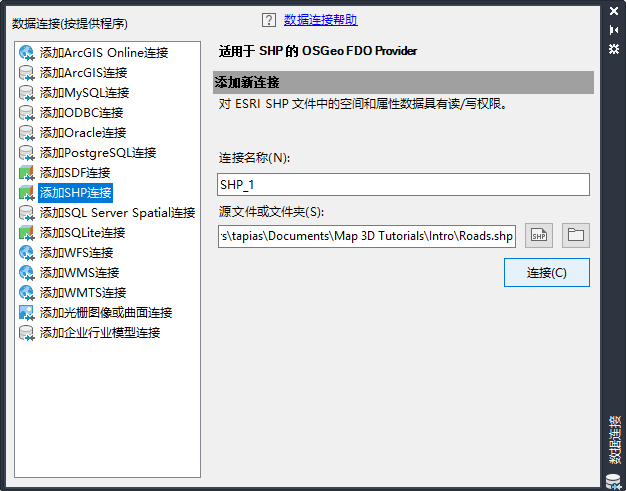 - 单击“连接”将道路 SHP 文件添加为数据源。