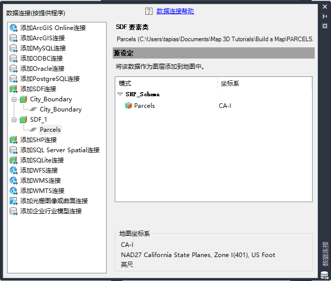 即使您未使用数据连接来附着非 DWG 数据源,数据连接也会显示有关所有附着的非 DWG 数据源的信息。 例如,拖放到地图中的 SDF 文件将列于“数据连接”窗口中。