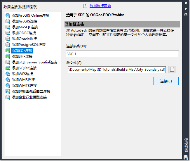 - 在仍处于打开状态的“数据连接”窗口中,在“通过提供程序进行数据连接”下再次选择“添加 SDF 连接”。