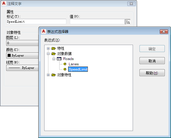 如果图形包含对象数据或者被链接到外部数据,您可以指定该数据的特性作为注释的值。这些特性是动态的。将注释附着到对象时,每个对象都针对该特性显示其自己的值。