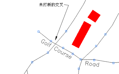 在建立网络拓扑或使用地形等高线时,此动作具有重要作用。第一个样例显示了网络拓扑中数字化成两个线性对象的四个线性对象;使用“打断交叉对象”后,这两个线性对象变成在一个公共点处相交的四个独立对象。
