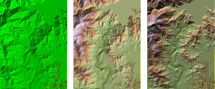 此插图显示:三维曲面的默认外观(左)、高程专题(中)、使用山体阴影(右)。