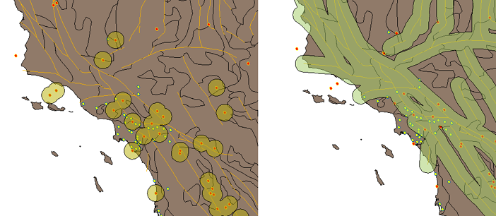 点要素周围的缓冲区(地震)与线性要素(断层线)。