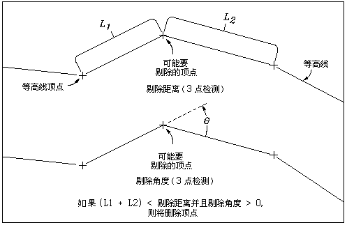 剔除三维多段线上的点是通过计算该点相对于其前后顶点的位置进行的。如果这三个点之间的长度小于剔除长度值,且偏转角度小于剔除角度值,则不向等高线数据文件添加中间点。