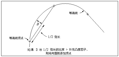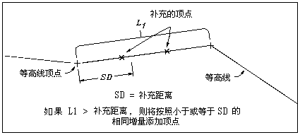 使用增补因子可以沿三维多段线增补或添加顶点。增补距离是顶点之间的最大距离。如果等高线上的顶点之间的距离大于增补因子,则采用小于或等于增补距离的等间距沿等高线添加点。增补距离越小,增补的点数就越多。