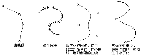- 使用 PLINE 或 MAPDIGITIZE 数字化不规则曲线时,选定顶点间的间距应取决于线段的曲率。线段越直,要求的点越少。
