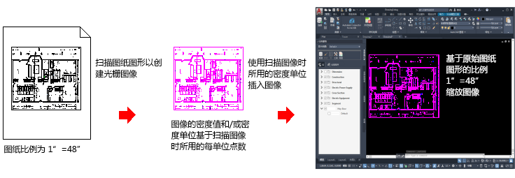 下例中的图像是以 1 英寸 = 48 英寸 的图纸比例绘制的,以每英寸 300 点扫描,并使用 300 作为密度值和使用英寸作为密度单位插入到图形中。然后,此图像基于其图纸比例 1" = 48" 进行缩放。