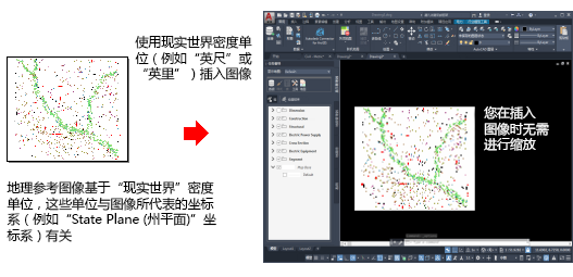 下例显示了密度单位与地理参照图像之间的关系。因为无需考虑图纸比例,所以可以使用图像表示的单位插入图像(例如英尺或英里),并且插入图像时无需进行缩放。