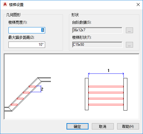设置楼梯的几何图形设置。括号内指明的数值与预览图像中位号的几何图形相对应。
