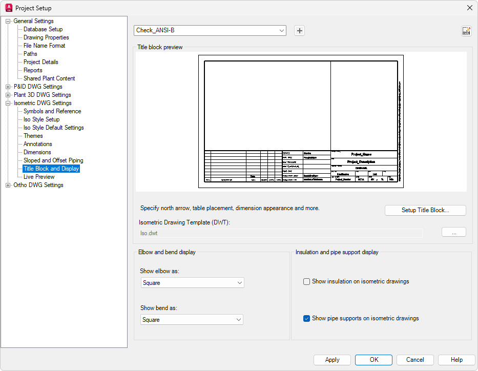 - 在“项目设置”对话框中,展开“等轴测 DWG 设置”。单击“标题栏和显示”。