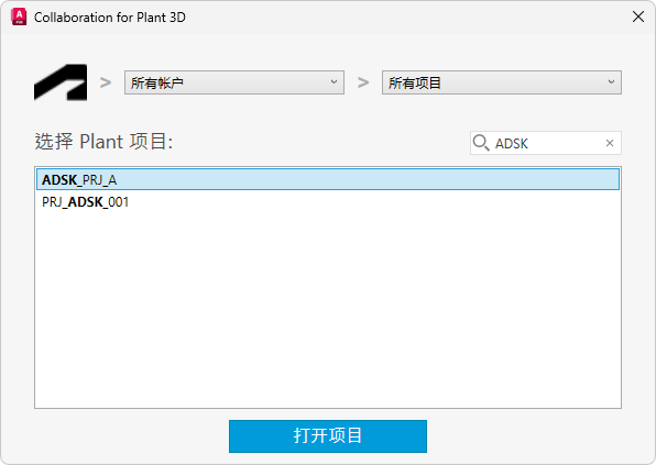 将显示一个您有权访问的 Plant 项目列表。左侧的下拉列表(在 Plant 项目上方)显示您有权访问的 Forma Data Management 帐户。右侧的下拉列表显示您有权访问的该帐户内的 Forma (Autodesk) 项目文件夹。