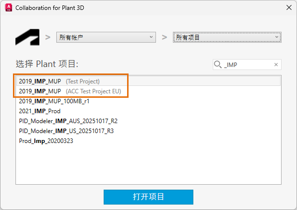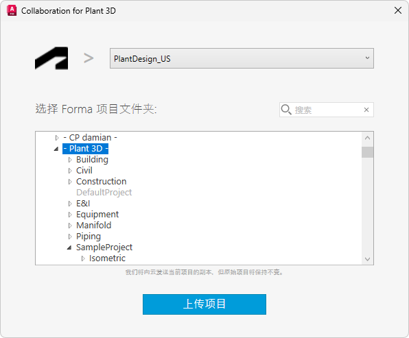 打开协作项目时,如果您具有必要的访问权限,则可以从 Forma Data Management 帐户选择 Plant 项目。