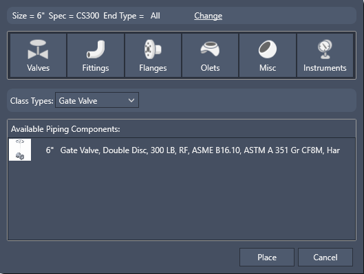 在“可用管道元件”中,单击元件(例如“闸阀,整体楔形,300LB,RF”)。