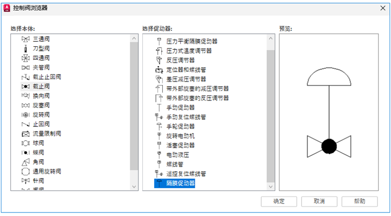 如果是第一次将控制阀添加到项目,会显示“控制阀浏览器”对话框。选择一个控制阀体和一个执行机构,然后单击“确定”。选择阀体或促动器时会显示预览。在绘图区域中,单击以放置控制阀。出现提示时,在图形中再次单击以放置注释。