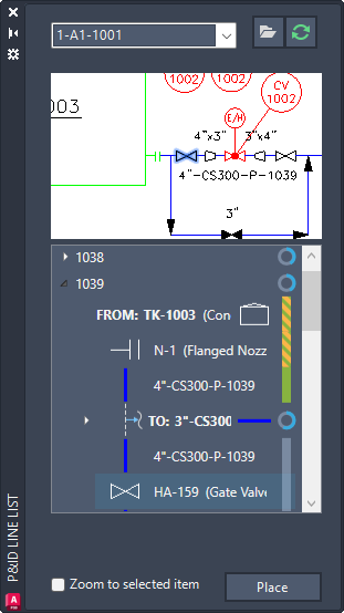 可以从“P&ID 线列表”中选择阀、管件和嵌入式仪表,并在模型中放置映射的 Plant 3D 对应对象。