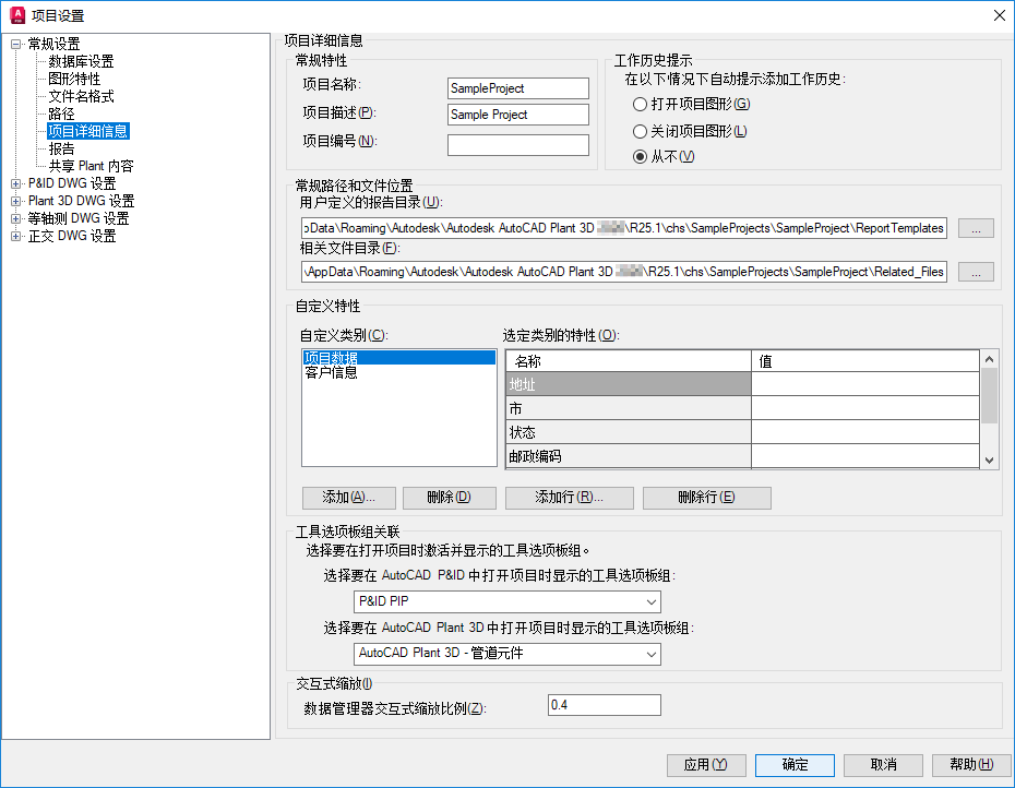 其他常规项目信息包括路径、工作历史提示设置、数据管理器缩放设置和工具选项板组关联。
