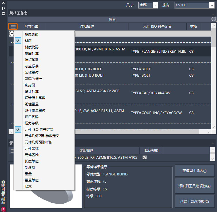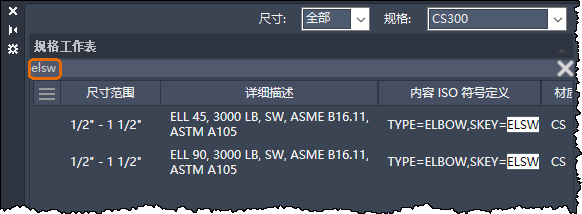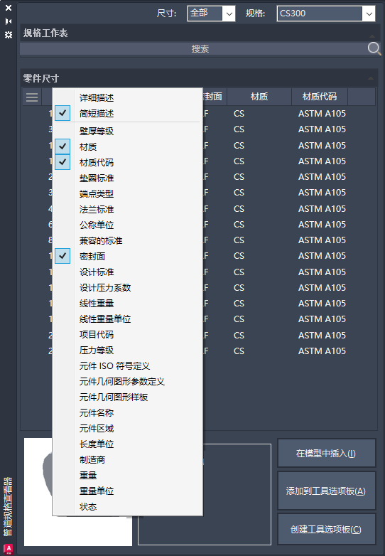 管道等级库查看器使您可以自定义列和搜索非显示特性。