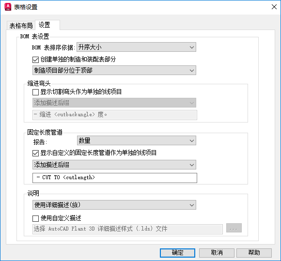 - 选择或清除“使用自定义描述”复选框。如果选中此复选框,单击 [...] 按钮来定位到需要的 AutoCAD Plant 3D toolset 详细描述样式 (.lds) 文件。此文件将为 BOM 表中的所有描述设置格式。单击“确定”。