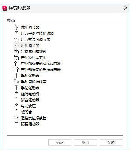 显示执行机构列表,可以从中选择执行机构来将手动阀转换为控制阀。单击列表中的项目以将其选中。