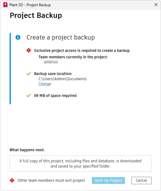 备份对于协作项目特别有用,它使您可以创建现有协作项目的本地副本并拥有随时可用的最新版本。如果协作项目中的其他用户检出项目设置或图形,系统将显示一条警告消息。您仍然可以继续进行备份,但备份不会包括未保存的更改。