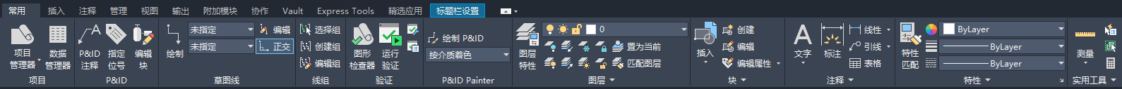 P&ID“常用”选项卡显示用于处理 P&ID 图形的选项。此选项卡包括以下面板: