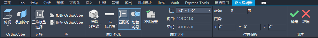 在项目管理器的“正交图形”选项卡上创建或打开图形时,会进入专用的正交环境,这时将显示这个专用的上下文功能区选项卡。它包含专属于正交视图环境的命令。此上下文选项卡及其关联面板显示为绿色,提供一个专用环境的视觉反馈。退出该环境时,此上下文选项卡会关闭。