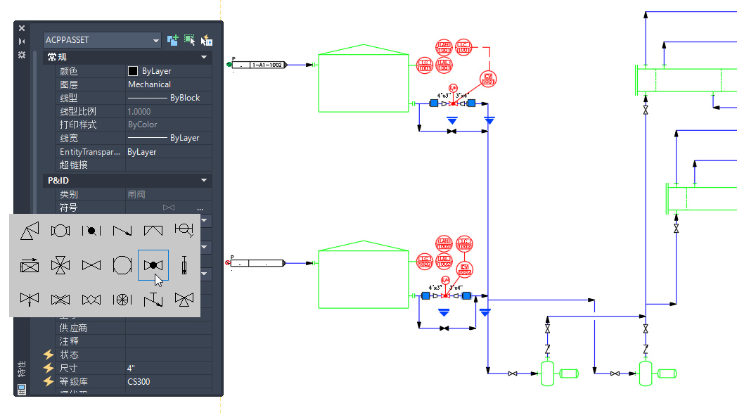 在 P&ID 图形中,可以使用替换夹点或“特性”选项板将一个元件或线替换为其他元件或线。