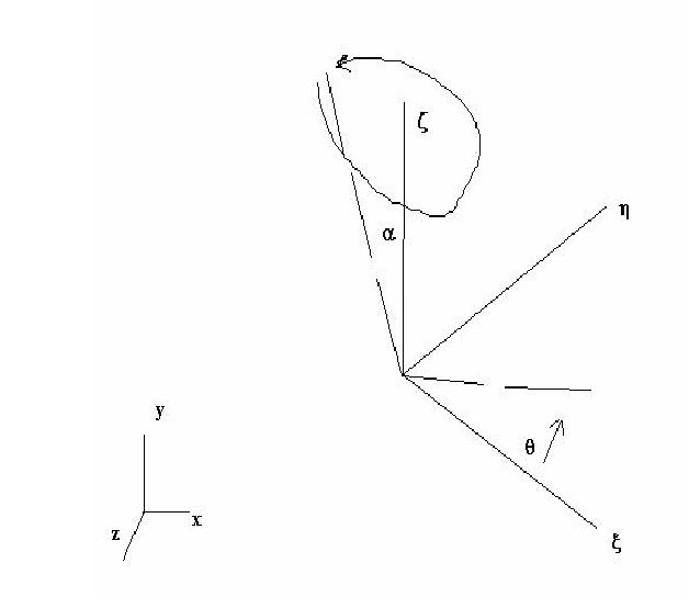 Here, we have subtracted off the non-perpendicular vector to yield the perpendicular distance between the origin of the orbiting system and the axis of the rotating system. The vector (Ux, Uy, Uz) is a unit vector that described the axis of rotation for the orbiting system.