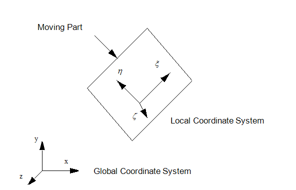 To allow for arbitrary motion, a local coordinate system is placed within each moving part. It is assumed that the part does not move with respect to this local coordinate system. Rather, the local coordinate system moves relative to the global coordinate system.