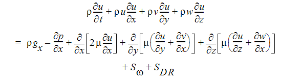 The two source terms in the momentum equations are for rotating coordinates and distributed resistances respectively. The distributed resistance term can be written in general as: