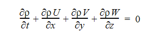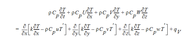 where U is the mean velocity and u' is the fluctuation about that mean. This representation is substituted into the governing equations and the equations themselves are averaged over time. Using the notation that capital letters represent the mean values and lower case letters represent fluctuating values except for temperature, the averaged governing equations can be written as: