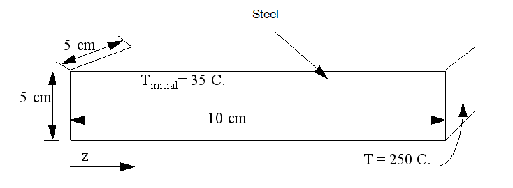 For this case, transient heat transfer in a 3-D steel block is modeled. We apply insulated boundary conditions on 2 dimensions so that the analytical expression for transient conduction in a semi-infinite solid can be used.