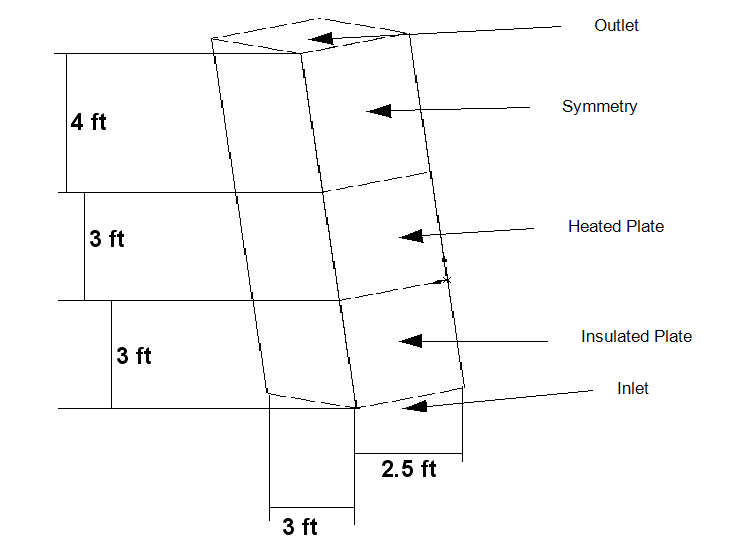 The unmarked surfaces are symmetry surfaces. The vertical plate starts at the inlet and is not heated for the first 3 feet. This allows the thermal boundary layer to grow separately from the momentum boundary layer.