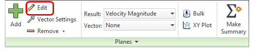 The colors are nice, but we need vectors to really understand the flow! To show vectors, click Results (tab) > Results Tasks (panel) > Planes, and click Edit from the Planes context menu: