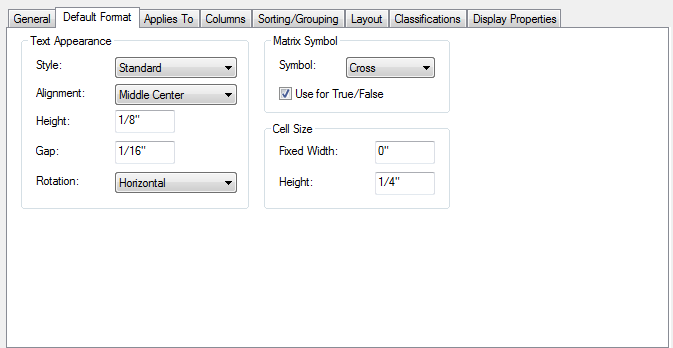 - Select or clear Use for True/False to control whether matrix symbols or the text in the property data format is used for true/false values.