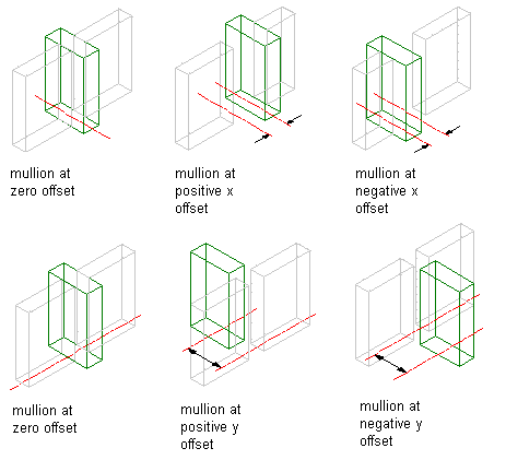 X For vertical mullions, a positive X offset moves the mullions toward the end of the curtain wall unit, while a negative X offset moves the mullions toward the start of the curtain wall unit. For horizontal mullions, a positive X offset moves the mullions toward the top of the curtain wall unit, while a negative X offset moves the mullions toward the bottom of the curtain wall unit.